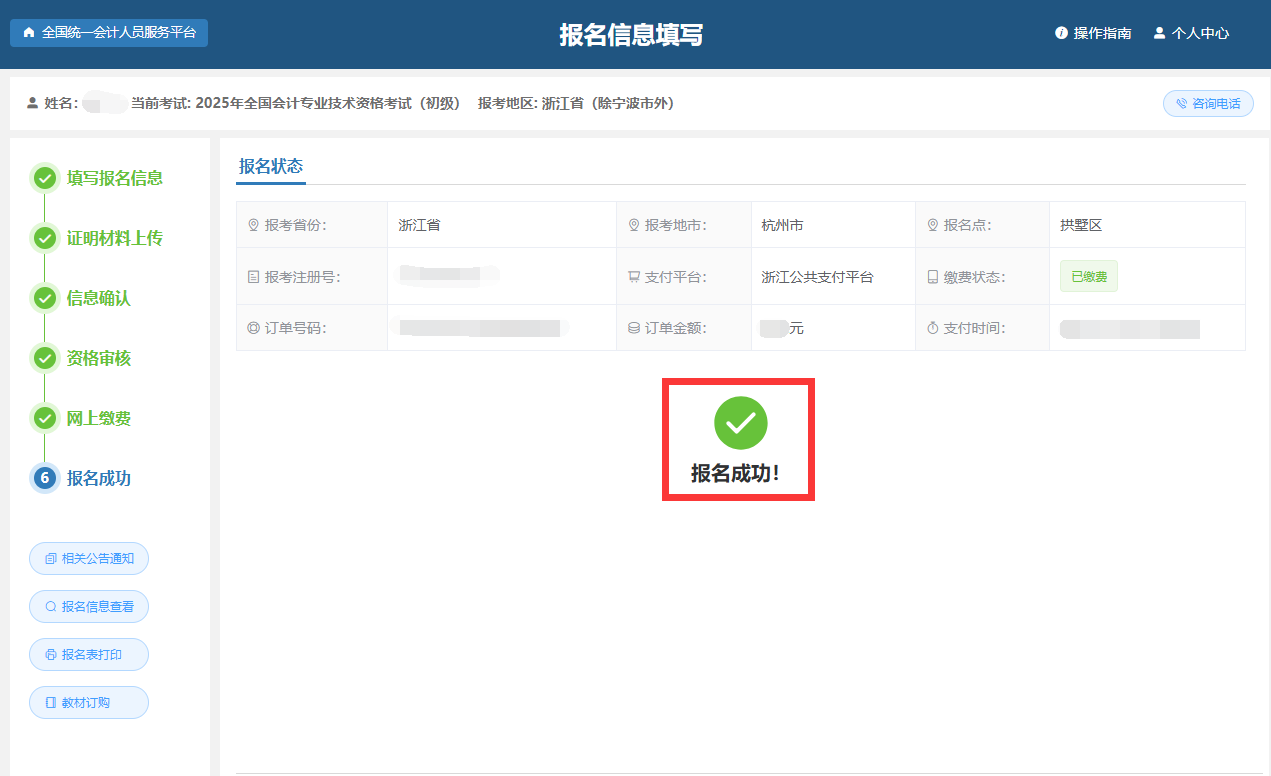 答:完成網(wǎng)上繳費(fèi)后,考生須回到考試報(bào)名頁(yè)面,報(bào)名狀態(tài)顯示為“ √報(bào)名成功 ”字樣,即表明網(wǎng)上報(bào)名成功。如圖所示: