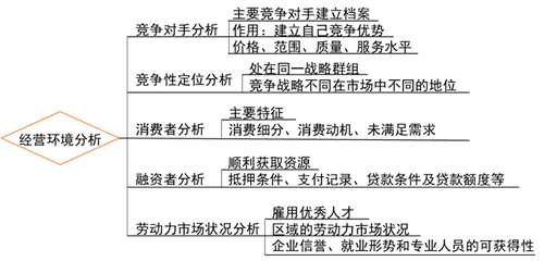 經(jīng)營環(huán)境分析包括競爭對手分析、競爭性定位分析、消費(fèi)者分析、融資者分析、勞動力市場狀況分析等。