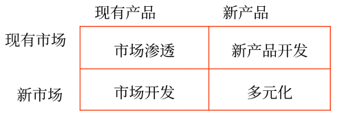 密集型成長(zhǎng)戰(zhàn)略具體類型有:市場(chǎng)滲透、市場(chǎng)開發(fā)(自己開拓市場(chǎng))、新產(chǎn)品開發(fā)(自己創(chuàng)新產(chǎn)品)。
