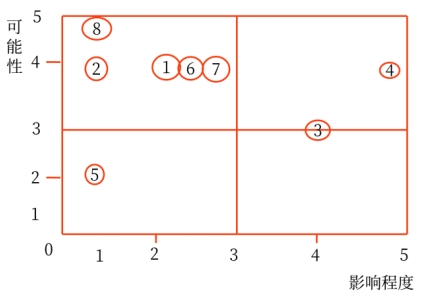 (3)確定風險重要性水平,分別將風險可能性和影響程度在風險矩陣中表示(橫軸表示風險影響程度,縱軸表示可能性),形成風險矩陣圖。如下圖所示,圖中1~8為事件。