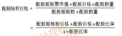 通常配股在股權(quán)登記日后要對股票進(jìn)行除權(quán)處理。除權(quán)后股票的理論除權(quán)基準(zhǔn)價(jià)格為: