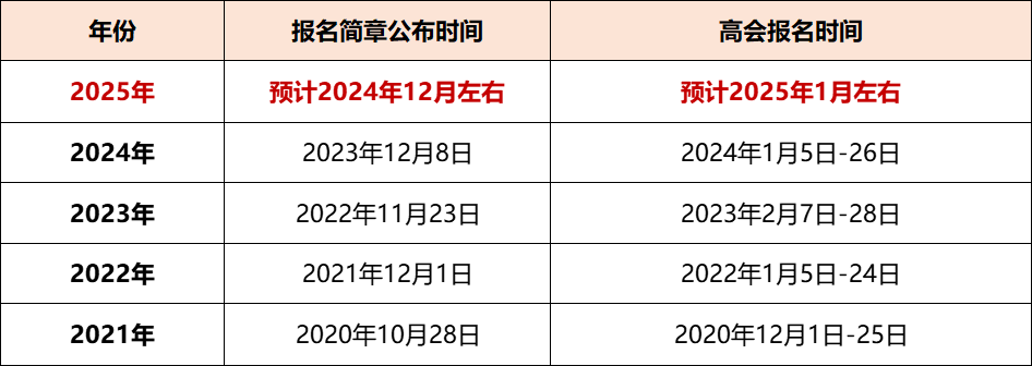 參考過去幾年的數(shù)據(jù)表明,報名簡章的公布時間通常在考試前一年的年底公布,次年初開始報名。為避免錯過報名時間,點(diǎn)擊預(yù)約報名提醒,及時通知您>>