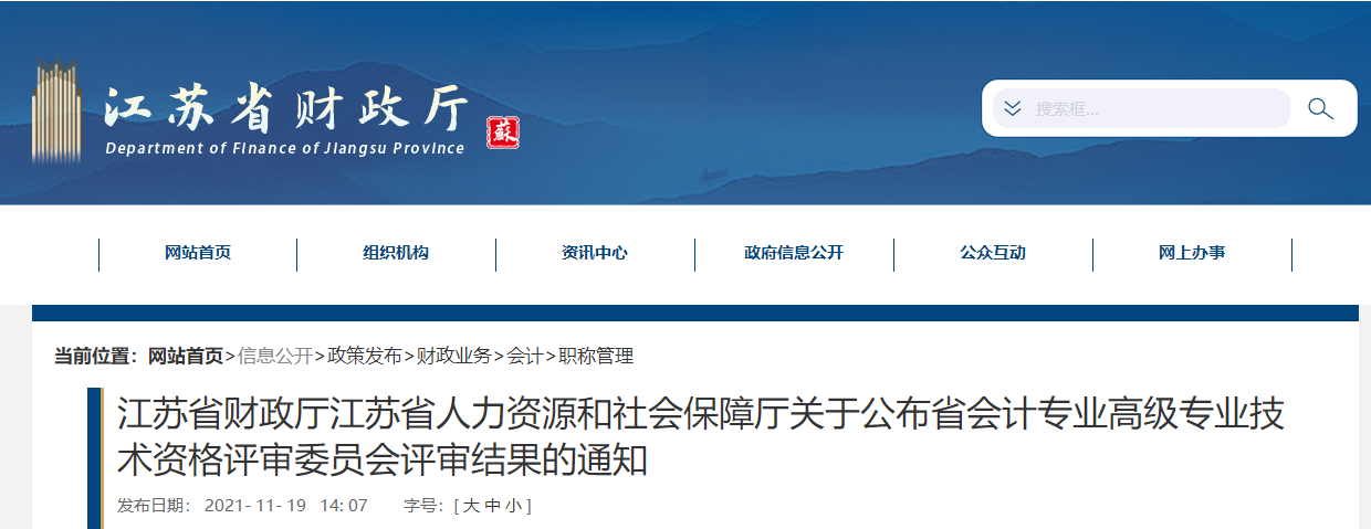 江蘇省財政廳江蘇省人力資源和社會保障廳關(guān)于公布省會計專業(yè)高級專業(yè)技術(shù)資格評審委員會評審結(jié)果的通知