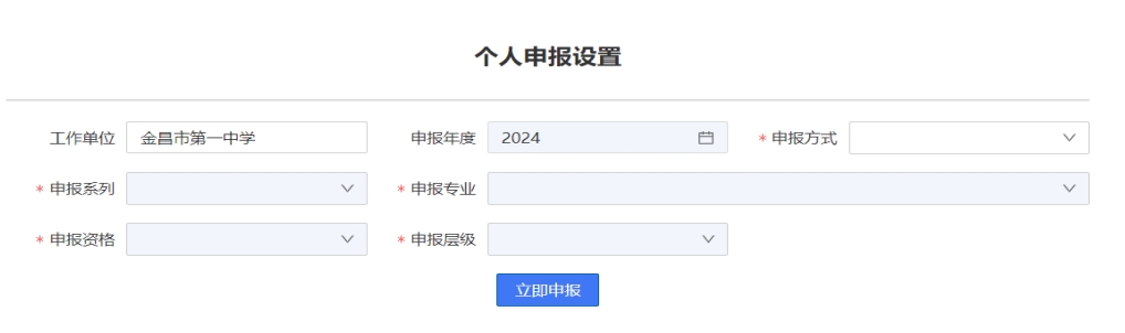 根據(jù)自身申報需求在各自下拉菜單中選擇申報方式、申報系列、申報專業(yè)、申報資格名稱、申報層級、有效范圍后,可點擊【立即申報】按鈕,如下圖所示。