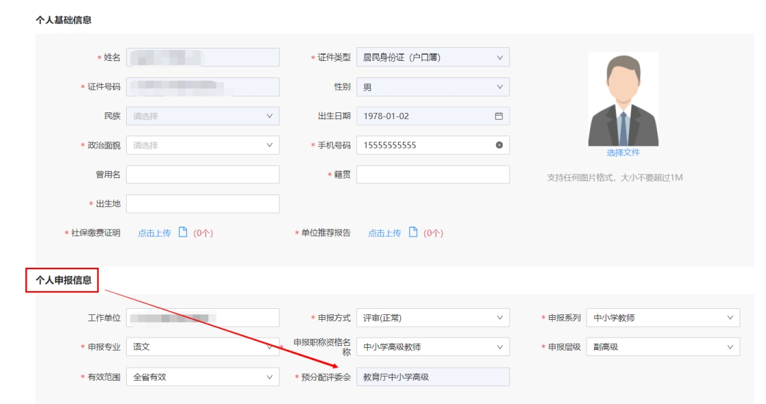 在點擊【立即申報】按鈕后,可進入本人信息填報頁面,可查看系統(tǒng)“預分配評委會”信息,如下圖所示。