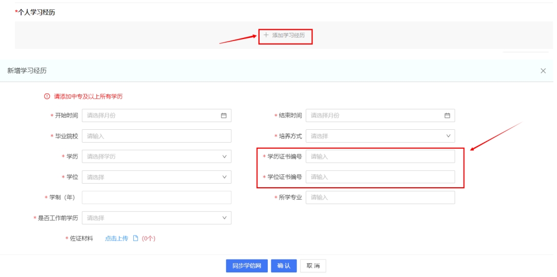 在頁面“個人學習經(jīng)歷”模塊,點擊【添加學習經(jīng)歷】,在彈窗內(nèi)輸入學歷相關(guān)信息,輸入學歷、學位證書編號后點擊【同步學信網(wǎng)】按鈕,系統(tǒng)將自動匹配學信網(wǎng)學歷平臺的信息,學歷信息填寫完成后,可點擊【確認】按鈕保存,可添加多條學習經(jīng)歷,如下圖所示。
