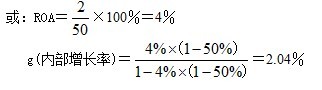 1.(1)g(內(nèi)部增長(zhǎng)率)=[(2/50)×(1-50%) ]/[1-(2/50)×(1-50%)]=2.04%(2分)