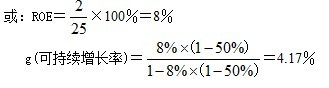 g(可持續(xù)增長(zhǎng)率)=[(2/25)×(1-50%)]/[1-(2/25)×(1-50%)]=4.17% (2分)