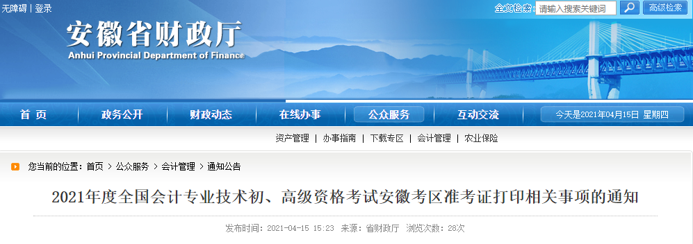 我省會(huì)計(jì)專業(yè)技術(shù)初、高級(jí)資格無(wú)紙化考試將在2021年5月15日—2021年5月19日舉行。根據(jù)全國(guó)會(huì)計(jì)考辦統(tǒng)一部署,我省近日將完成2021年度全國(guó)會(huì)計(jì)專業(yè)技術(shù)初、高級(jí)資格考試安徽考區(qū)考點(diǎn)(場(chǎng))的編排工作?,F(xiàn)就我省準(zhǔn)考證打印相關(guān)事項(xiàng)通知如下,請(qǐng)各位考生仔細(xì)閱讀: