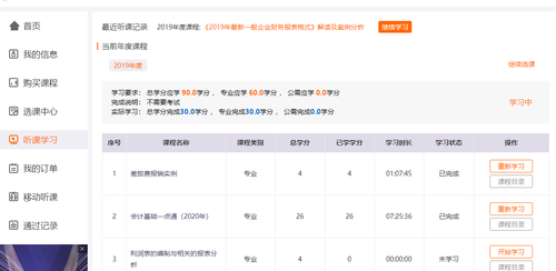 4. 聽課流程:選擇左側(cè)導航欄處聽課學習,會出現(xiàn)所選的所有課程,如圖所示:若學員還未開始學習時,課程后面彩色字樣是“開始學習”;若是一節(jié)課程沒學完,會顯示“繼續(xù)學習”字樣;若是一節(jié)課程完全學習完成,相應后面會顯示“重新學習”字樣,望學員周知。