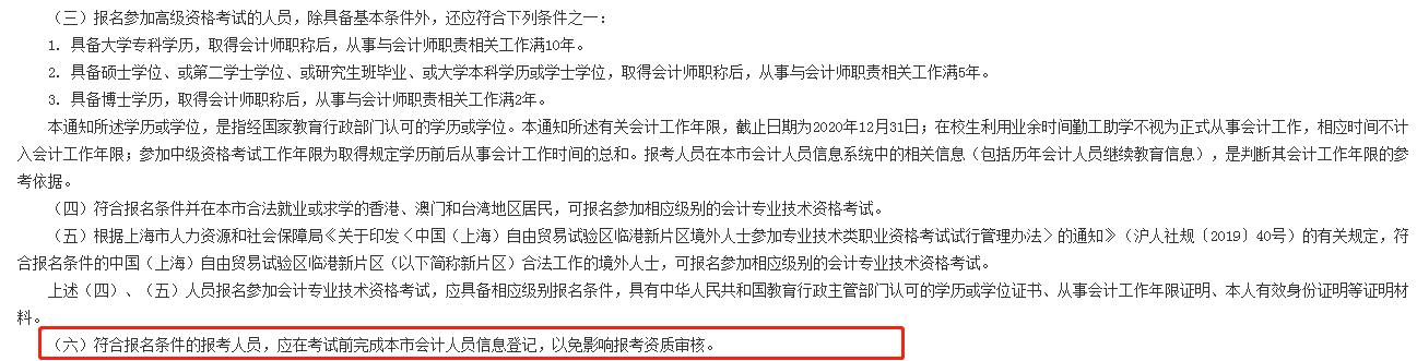 1.上海市在2020年會(huì)計(jì)專業(yè)技術(shù)中高級(jí)考試報(bào)名條件中提出,根據(jù)報(bào)考人員在本市會(huì)計(jì)人員信息系統(tǒng)中的相關(guān)信息(包括歷年會(huì)計(jì)人員繼續(xù)教育信息記錄)來判斷其會(huì)計(jì)工作年限的參考。