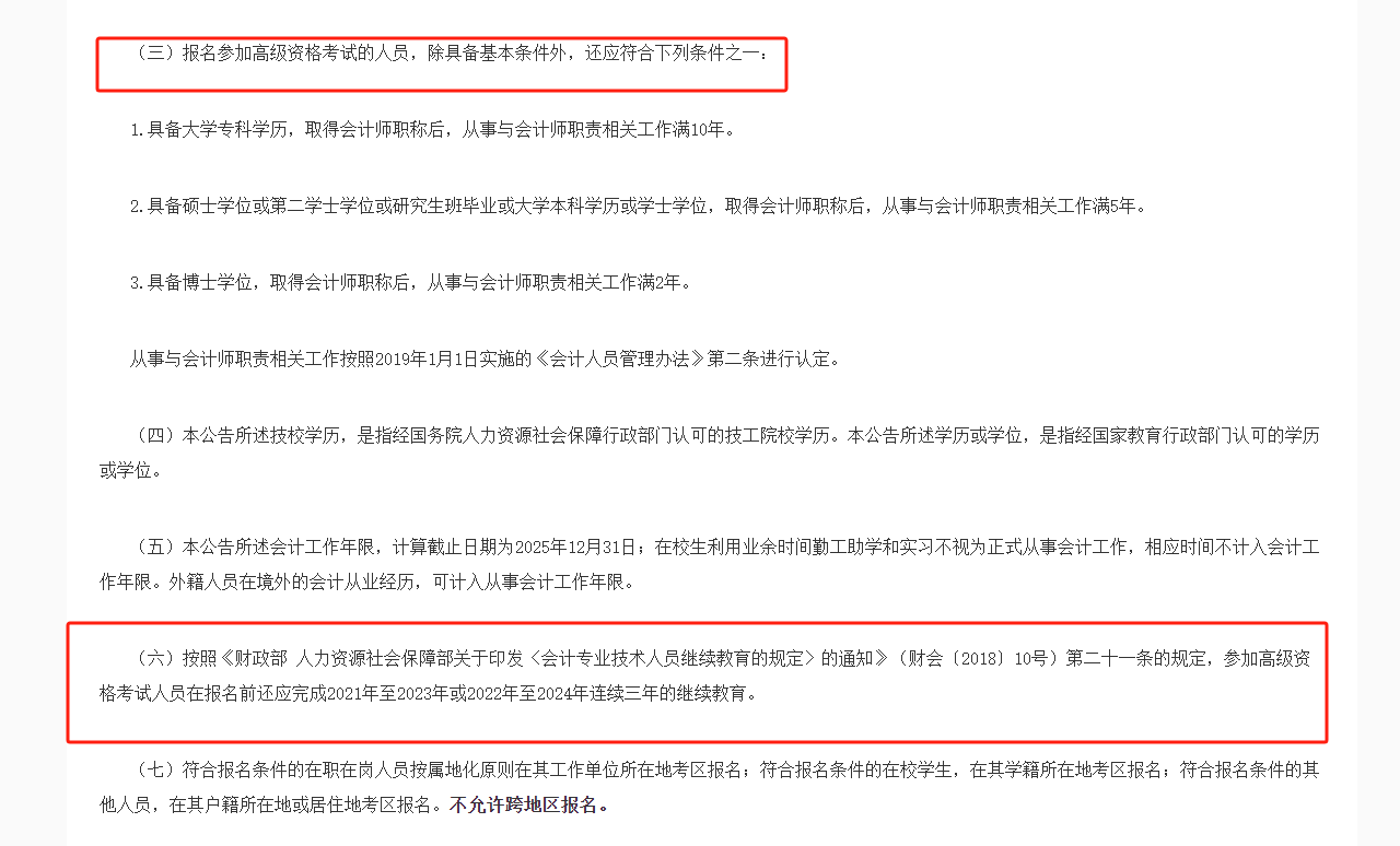江西】:按照《財政部 人力資源社會保障部關于印發(fā)〈會計專業(yè)技術人員繼續(xù)教育的規(guī)定〉的通知》(財會〔2018〕10號)第二十一條的規(guī)定,參加高級資格考試人員在報名前還應完成2021年至2023年或2022年至2024年連續(xù)三年的繼續(xù)教育。