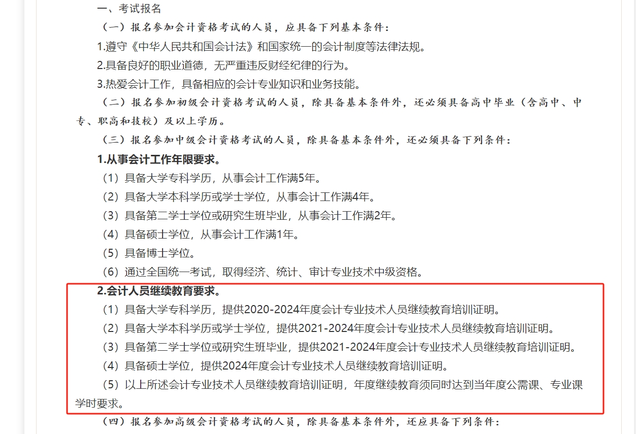2025年青海省、山東省、新疆等地在中級會計報考條件中明確提出:應(yīng)具有規(guī)定年度的繼續(xù)教育記錄,或是完成規(guī)定年限的繼續(xù)教育。