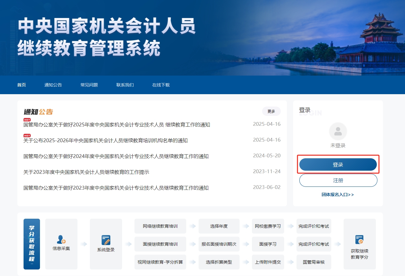 會(huì)計(jì)人員可進(jìn)入中央國家機(jī)關(guān)高級會(huì)計(jì)人員繼續(xù)教育網(wǎng)站(https://ggjgk.dongao.cn/),點(diǎn)擊“立即登錄”,進(jìn)入中央國家機(jī)關(guān)會(huì)計(jì)人員繼續(xù)教育管理系統(tǒng)。