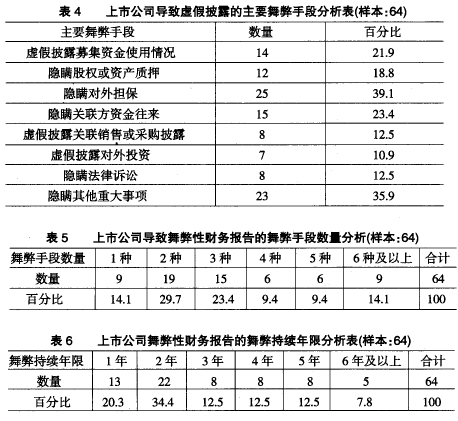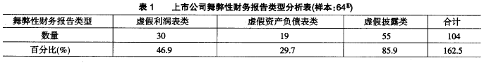 如表1所示,在發(fā)布了舞弊性財(cái)務(wù)報(bào)告的64家上市公司中,分別有46.9%、29.7%和85.9%的上市公司發(fā)布了虛假利潤(rùn)表、虛假資產(chǎn)負(fù)債表、虛假披露?梢姡硗馕璞资巧鲜泄疚璞仔载(cái)務(wù)報(bào)告的最主要類型。
