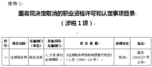 2.國務(wù)院決定取消的職業(yè)資格許可和認定事項目錄(涉稅1項)