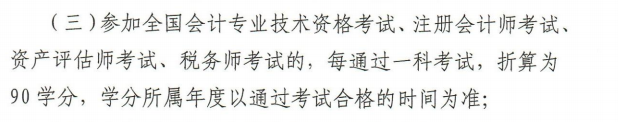 參加全國會計專業(yè)技術(shù)資格考試、注冊會計師考試、資產(chǎn)評估師考試、稅務師考試的,每通過一科考試,折算為90學分,學分所述年度為培訓年度;