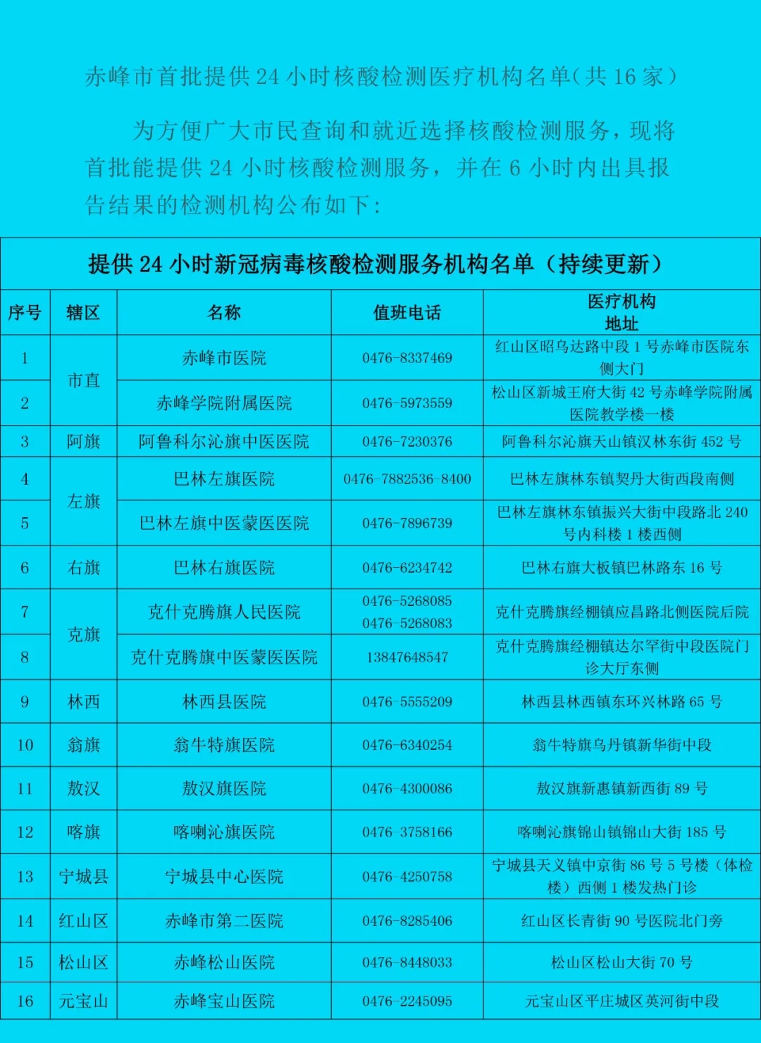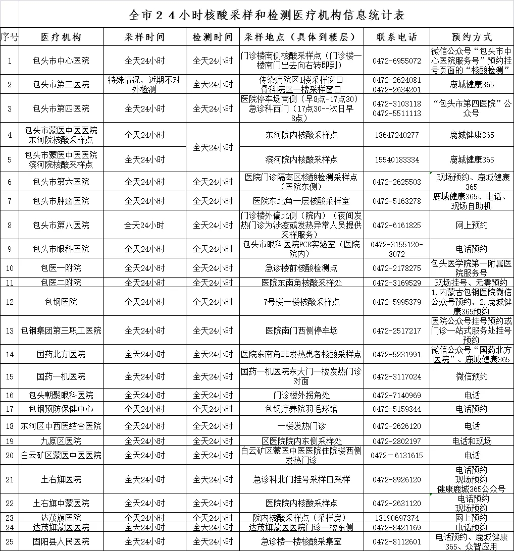 為更好的滿足群眾核酸檢測(cè)需求,提供優(yōu)質(zhì)高效的核酸采樣和檢測(cè)服務(wù),現(xiàn)將全市開展24小時(shí)核酸采樣和檢測(cè)服務(wù)醫(yī)療機(jī)構(gòu)名單公布如下。請(qǐng)根據(jù)表中核酸檢測(cè)預(yù)約方式提前預(yù)約核酸檢測(cè)。