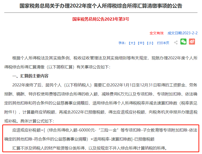 關(guān)于辦理2022年度個人所得稅綜合所得匯算清繳事項的公告