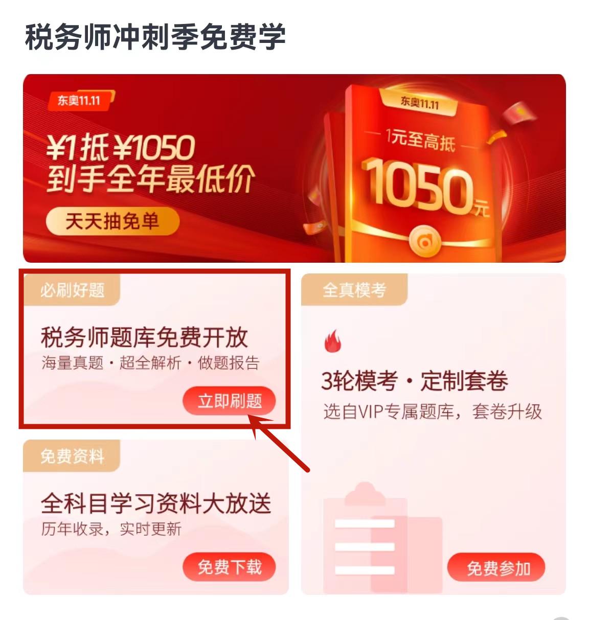 在稅務(wù)師頻道首頁找到稅務(wù)師沖刺季免費學板塊,點擊「立即刷題」