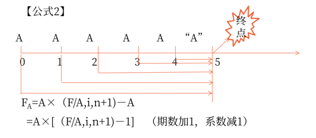 公式2:FA=A×[(F/A,i,n+1)-1](期數(shù)加1,系數(shù)減1)