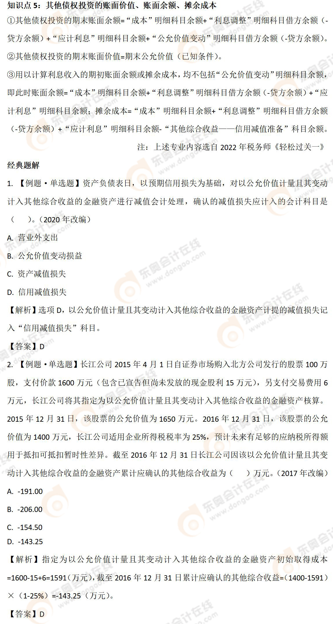 知識(shí)點(diǎn):其他債權(quán)投資的賬面價(jià)值、賬面余額、攤余成本