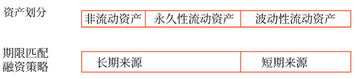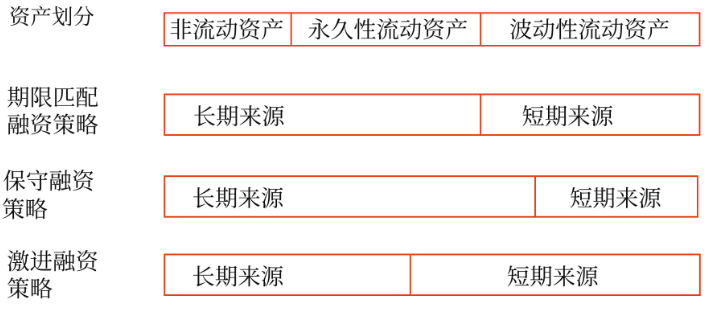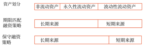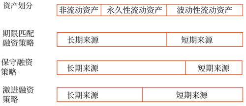 根據(jù)資產(chǎn)的期限結(jié)構(gòu)與資金來源的期限結(jié)構(gòu)的匹配程度差異,流動資產(chǎn)的融資策略可以劃分為:期限匹配融資策略、保守融資策略和激進(jìn)融資策略三種基本類型。