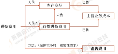 商品流通企業(yè)在采購商品過程中發(fā)生的運輸費、裝卸費、保險費以及其他可歸屬于存貨采購成本的費用等(即進貨費用),有三種處理方法:
