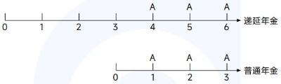 這里第一個(gè)圖示是一個(gè)連續(xù)收付期為3期的遞延年金,第二個(gè)圖示則是一個(gè)3期的普通年金,通過(guò)對(duì)比可以看出,該遞延年金是將3期的普通年金向后遞延3期,因此遞延期為3。