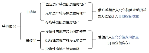 【提示】此處所指非投資性房地產(chǎn),指固定資產(chǎn)(房)、無形資產(chǎn)(地)和房地產(chǎn)開發(fā)企業(yè)的存貨(商品房)。故“非投資性房地產(chǎn)”與“公允價值計量的投資性房地產(chǎn)”之間的轉(zhuǎn)換分2類共6種情況。