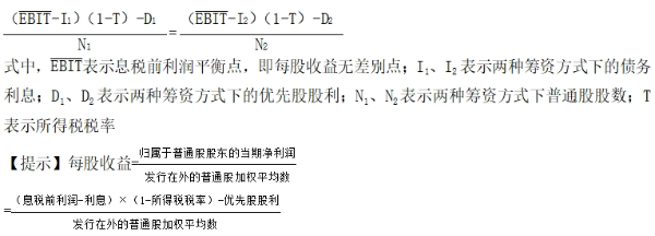 含義 | 所謂每股收益無差別點(diǎn),是指不同籌資方式下每股收益都相等時(shí)的息稅前利潤或業(yè)務(wù)量水平,根據(jù)該指標(biāo)對(duì)各備選方案進(jìn)行比較選擇 |