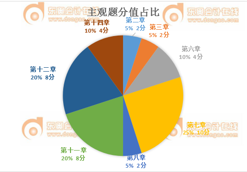 在了解完主觀題章節(jié)分布之后,我們一起來看一下各章節(jié)的分值占比。根據(jù)下圖我們可以得知:第七章的分值占主觀題的25%,也就是四分之一;第十一章、十二章分值各占20%;第六章、十四章分值各占10%;剩余章節(jié)均為5%。由此可見,第七章、第十一章、第十二章比較受到命題人的青睞,大家在備考時要多加學習。