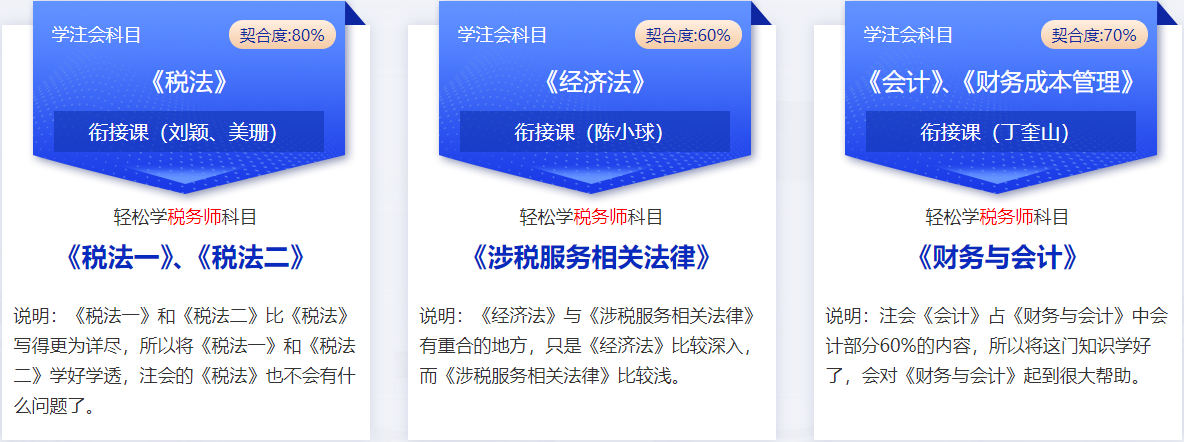 注會的《經(jīng)濟(jì)法》和稅務(wù)師的《涉稅服務(wù)相關(guān)法律》間的契合度高達(dá)60%;