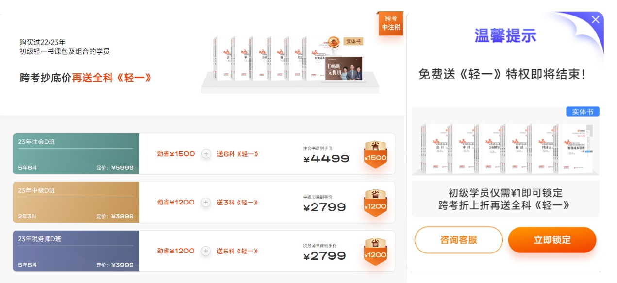 如果你是初級學員,想要跨考中、注、稅考試,那么趕緊參與1元跨考活動,活動中免費贈送《輕一》實體書的特權已經進入倒計時,從未有過的免費獲贈整套《輕一》實體書的先例,機會難得,想要報考的同學,千萬不要錯過。