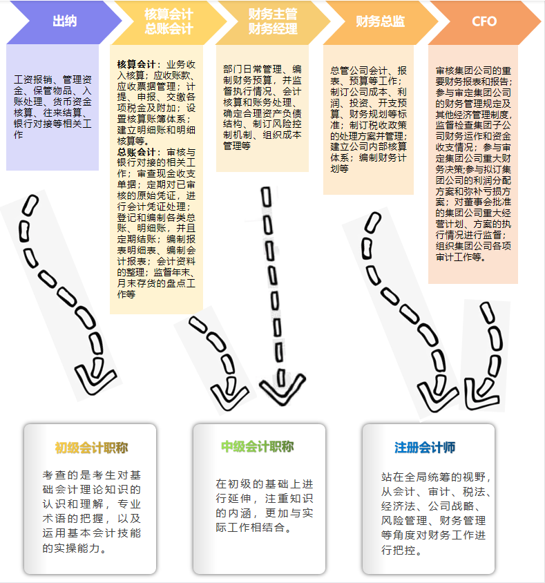 出納是每一位財會新人的必經(jīng)之路,擁有初級會計職稱證書后出納工作主要負責(zé)審核原始憑證、填制憑證等。而想要成為會計,還至少要一年后,尤其是總賬會計,不僅對工作年限有要求,持有中級證書也是一個指標(biāo)。而會計主管,一般是微小中型企業(yè)財會一把手,不僅要求中級會計證書或CPA,還要求管理者具備綜合管理能力。而財務(wù)總監(jiān)或CFO,CPA則是門檻。可以看出財會行業(yè)的職位晉升與財會行業(yè)的專業(yè)證書和工作經(jīng)驗密不可分,因此想要在財會行業(yè)有一定發(fā)展的就要有規(guī)劃地考取證書。