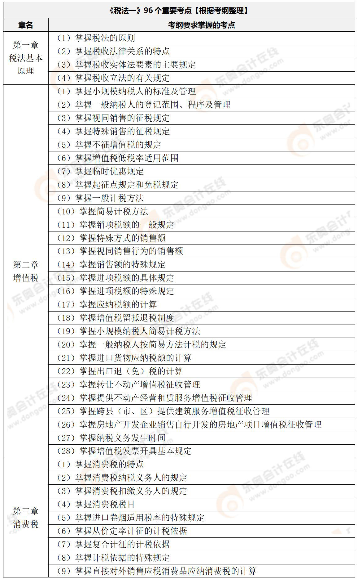 2024年稅務師考試時間暫未確定,在稅務師備考預習階段,考生可先通過了解各科目考點框架,對各科目難易程度及考查的內(nèi)容有大致了解,東奧會計在線根據(jù)考試大綱為大家整理了《稅法一》科目的96個重要考點,一起看下。