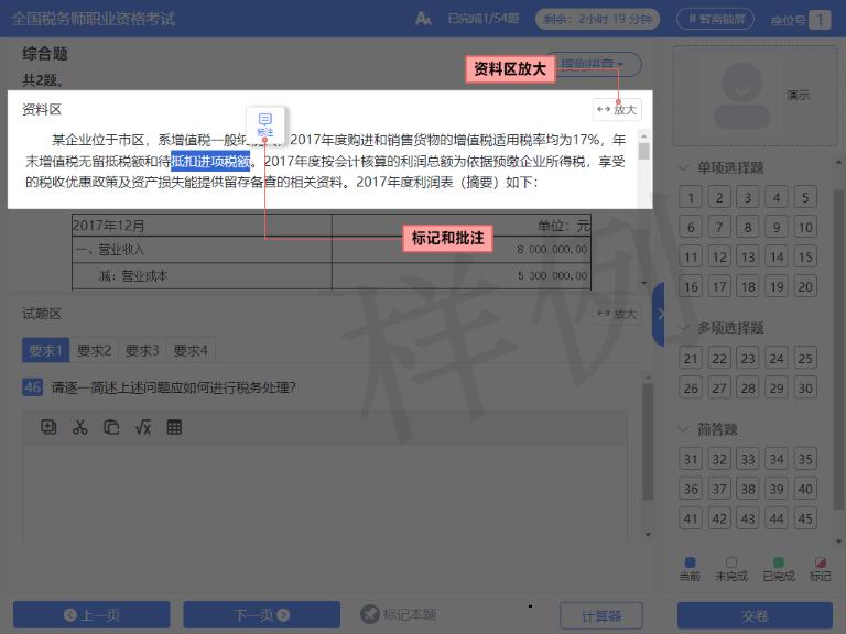 (7)考生對資料區(qū)使用標注功能,不會被作為答題結(jié)果,也不會影響考生得分情況。
