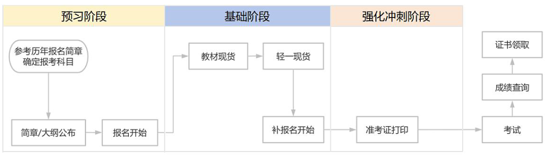 從報名到考試,考生大約有半年左右的時間可用于備考學習。如考生在預習階段即開始搶學,則備考時間會更加充裕。