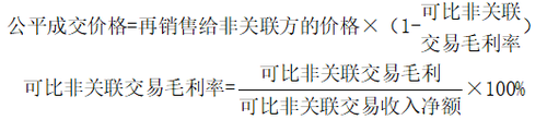 (1)再銷(xiāo)售價(jià)格法以關(guān)聯(lián)方購(gòu)進(jìn)商品再銷(xiāo)售給非關(guān)聯(lián)方的價(jià)格減去可比非關(guān)聯(lián)交易毛利后的金額作為關(guān)聯(lián)方購(gòu)進(jìn)商品的公平成交價(jià)格。其計(jì)算公式為: