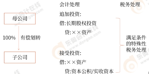 1.100%直接控制的母子公司之間,母公司向子公司按賬面凈值劃轉(zhuǎn)其持有的股權(quán)或資產(chǎn),母公司獲得子公司100%的股權(quán)支付。母公司按增加長(zhǎng)期股權(quán)投資處理,子公司按接受投資(包括資本公積,下同)處理。母公司獲得子公司股權(quán)的計(jì)稅基礎(chǔ)以劃轉(zhuǎn)股權(quán)或資產(chǎn)的原計(jì)稅基礎(chǔ)確定。(順流有償)
