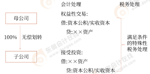 2.100%直接控制的母子公司之間,母公司向子公司按賬面凈值劃轉(zhuǎn)其持有的股權(quán)或資產(chǎn),母公司沒(méi)有獲得任何股權(quán)或非股權(quán)支付。母公司按沖減實(shí)收資本(包括資本公積,下同)處理,子公司按接受投資處理。(順流無(wú)償)
