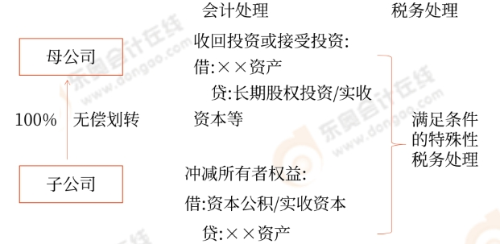 3. 100%直接控制的母子公司之間,子公司向母公司按賬面凈值劃轉(zhuǎn)其持有的股權(quán)或資產(chǎn),子公司沒(méi)有獲得任何股權(quán)或非股權(quán)支付。母公司按收回投資處理,或按接受投資處理,子公司按沖減實(shí)收資本處理。母公司應(yīng)按被劃轉(zhuǎn)股權(quán)或資產(chǎn)的原計(jì)稅基礎(chǔ),相應(yīng)調(diào)減持有子公司股權(quán)的計(jì)稅基礎(chǔ)。(逆流無(wú)償)