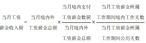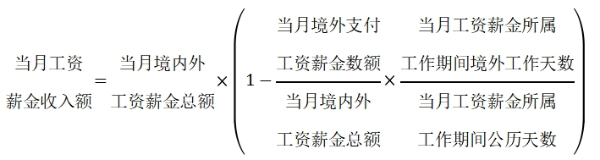 在一個(gè)納稅年度內(nèi),在境內(nèi)累計(jì)居住不超過(guò)90天的非居民個(gè)人,僅就歸屬于境內(nèi)工作期間并由境內(nèi)雇主支付或者負(fù)擔(dān)的工資薪金所得計(jì)算繳納個(gè)人所得稅。當(dāng)月工資薪金收入額的計(jì)算公式如下(公式一):