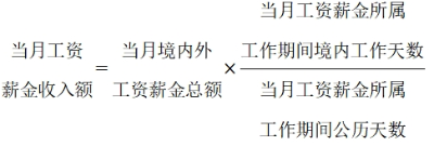 (4)無(wú)住所個(gè)人在境內(nèi)、境外單位同時(shí)擔(dān)任職務(wù)或者僅在境外單位任職,且當(dāng)期同時(shí)在境內(nèi)、境外工作的,按照工資薪金所屬境內(nèi)、境外工作天數(shù)占當(dāng)期公歷天數(shù)的比例計(jì)算確定來(lái)源于境內(nèi)、境外工資薪金所得的收入額。境外工作天數(shù)按照當(dāng)期公歷天數(shù)減去當(dāng)期境內(nèi)工作天數(shù)計(jì)算。