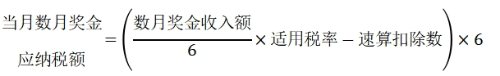 (2)非居民個(gè)人一個(gè)月內(nèi)取得數(shù)月獎(jiǎng)金,單獨(dú)按照規(guī)定計(jì)算當(dāng)月收入額,不與當(dāng)月其他工資薪金合并,按6個(gè)月分?jǐn)傆?jì)稅,不減除費(fèi)用,適用月度稅率表計(jì)算應(yīng)納稅額,在一個(gè)公歷年度內(nèi),對(duì)每一個(gè)非居民個(gè)人,該計(jì)稅辦法只允許使用一次。計(jì)算公式如下(公式五):