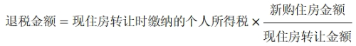 (3)新購住房金額小于現(xiàn)住房轉(zhuǎn)讓金額的,按新購住房金額占現(xiàn)住房轉(zhuǎn)讓金額的比例退還出售現(xiàn)住房已繳納的個(gè)人所得稅: