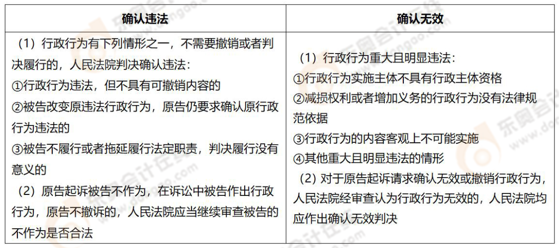 記憶背誦:確認(rèn)無效是針對(duì)重大且明顯違法的事項(xiàng),對(duì)原告的權(quán)益產(chǎn)生了實(shí)質(zhì)性損害;而判決確認(rèn)違法主要針對(duì)的是行政行為無法撤銷或者判決履行無意義的情況