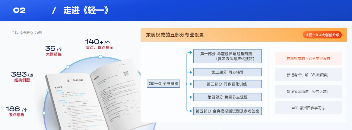 以《稅法一》為例,《輕一》中共含有186個考點精析、383個經(jīng)典例題、35個大題精練、140+個盲點、坑點提示。更有東奧引以為傲的五部分專業(yè)設(shè)置等超多升級,幫助考生更好的進(jìn)行備考。>>>點擊了解輕松過關(guān)系列圖書<<<