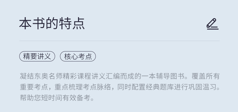 收到了,書的質(zhì)量很好,無論是內(nèi)容、紙張還是印刷。上網(wǎng)課配套書使用效果很好,看得出來東奧是有很用心在做培訓(xùn)教育。這個(gè)方向是正確的,希望能繼續(xù)堅(jiān)持!