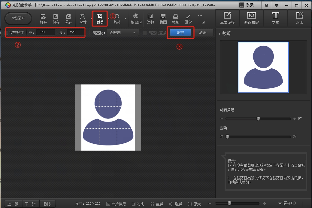 第三步:裁剪圖片。點擊“裁剪”按鈕,下方彈出尺寸設(shè)置,寬輸入178,高輸入220,點擊“確定”即可得到178像素×220像素的圖片。